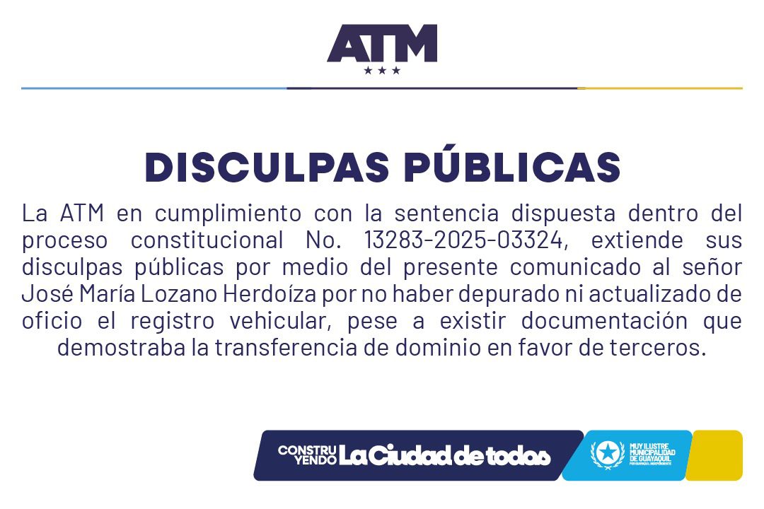 La ATM en cumplimiento con la sentencia dispuesta dentro del proceso constitucional No. 13283-2025-03324, extiende sus disculpas públicas por medio del presente comunicado al señor José María Lozano Herdoíza por no haber depurado ni actualizado de oficio el registro vehicular, pese a existir documentación que demostraba la transferencia de dominio en favor de terceros.