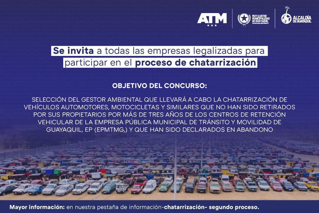SELECCIÓN DEL GESTOR AMBIENTAL QUE LLEVARÁ A CABO LA CHATARRIZACIÓN DE VEHÍCULOS AUTOMOTORES, MOTOCICLETAS Y SIMILARES QUE NO HAN SIDO RETIRADOS POR SUS PROPIETARIOS POR MÁS DE TRES AÑOS DE LOS CENTROS DE RETENCIÓN VEHICULAR DE LA EMPRESA PÚBLICA MUNICIPAL DE TRÁNSITO Y MOVILIDAD DE GUAYAQUIL, EP (EPMTMG,) Y QUE HAN SIDO DECLARADOS EN ABANDONO,SELECCIÓN DEL GESTOR AMBIENTAL QUE LLEVARÁ A CABO LA CHATARRIZACIÓN DE VEHÍCULOS AUTOMOTORES, MOTOCICLETAS Y SIMILARES QUE NO HAN SIDO RETIRADOS POR SUS PROPIETARIOS POR MÁS DE TRES AÑOS DE LOS CENTROS DE RETENCIÓN VEHICULAR DE LA EMPRESA PÚBLICA MUNICIPAL DE TRÁNSITO Y MOVILIDAD DE GUAYAQUIL, EP (EPMTMG,) Y QUE HAN SIDO DECLARADOS EN ABANDONO